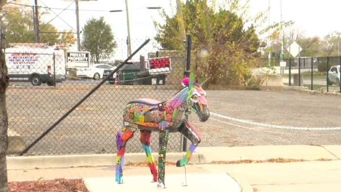 Five colorful sculptures, crafted from car parts and metal, are now lining the street. They include a big cat, a wolf, a dog, a donkey, and a giraffe.