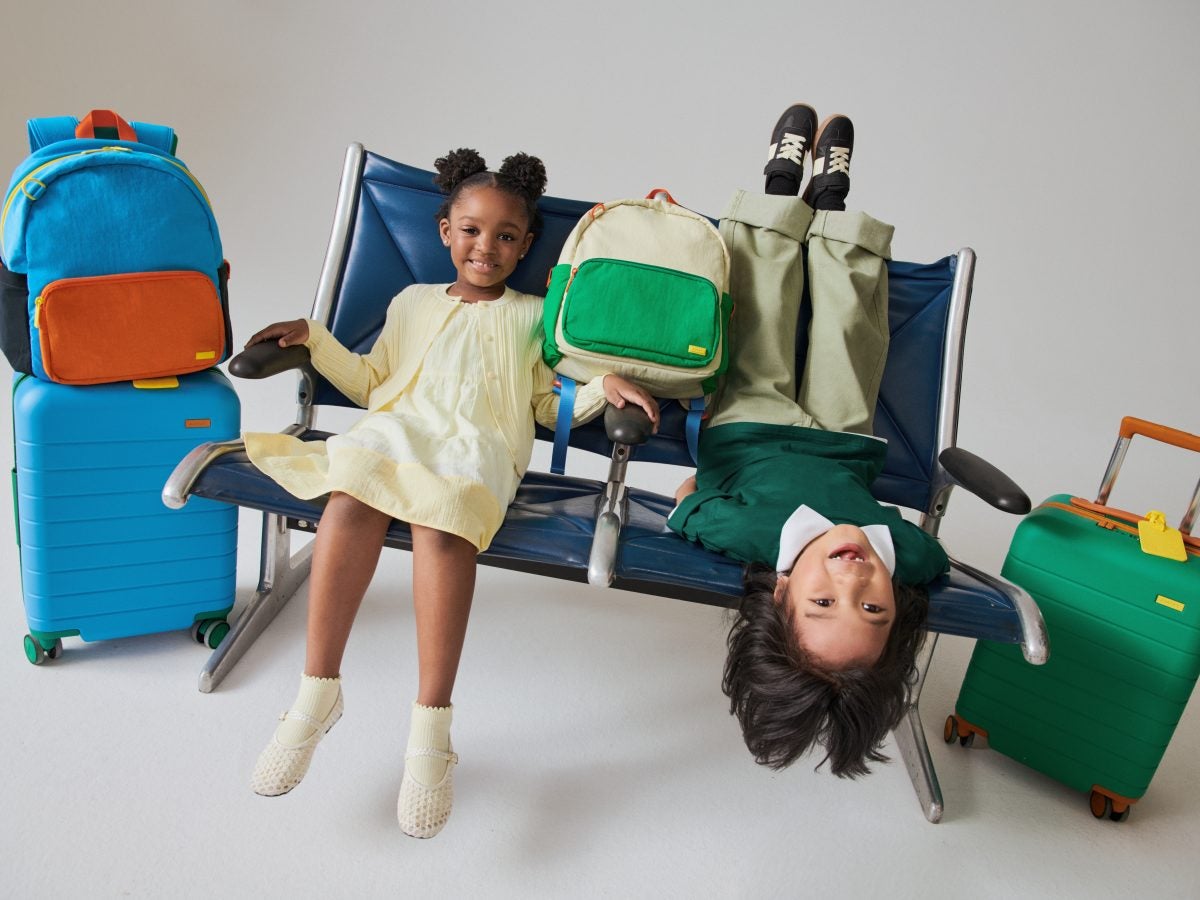 Away has launched their signature hardside pieces in smaller sizes (a carry-on) and colorful shades for the kiddos. Teach the children the importance of coordination (and swag) with a matching backpack, lunch bag, and packing cubes for travel days.