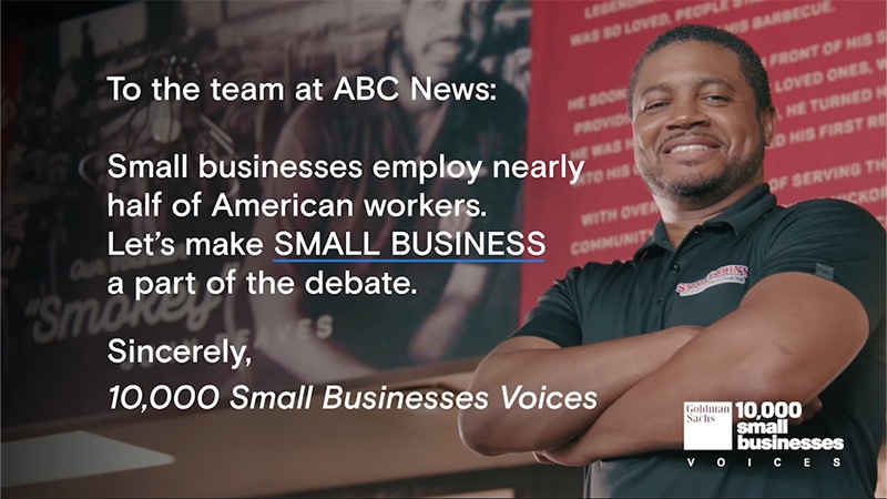 NEW YORK – Small business owners, who are disappointed with a lack of detailed policy discussions on issues important to them in the presidential election, are about to make a big splash. Ahead of the presidential debate on September 10th, Goldman Sachs 10,000 Small Businesses Voices today launched a new billboard in Times Square calling on ABC News to ask the candidates how they will address the most pressing issues facing small business owners.