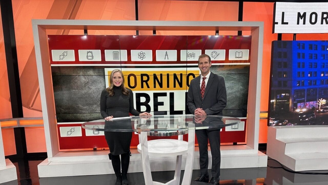 News 8’s Hanna Mordoh on the set of “The Morning Bell” with Sean Taylor, the next superintendent of Washington Township schools.