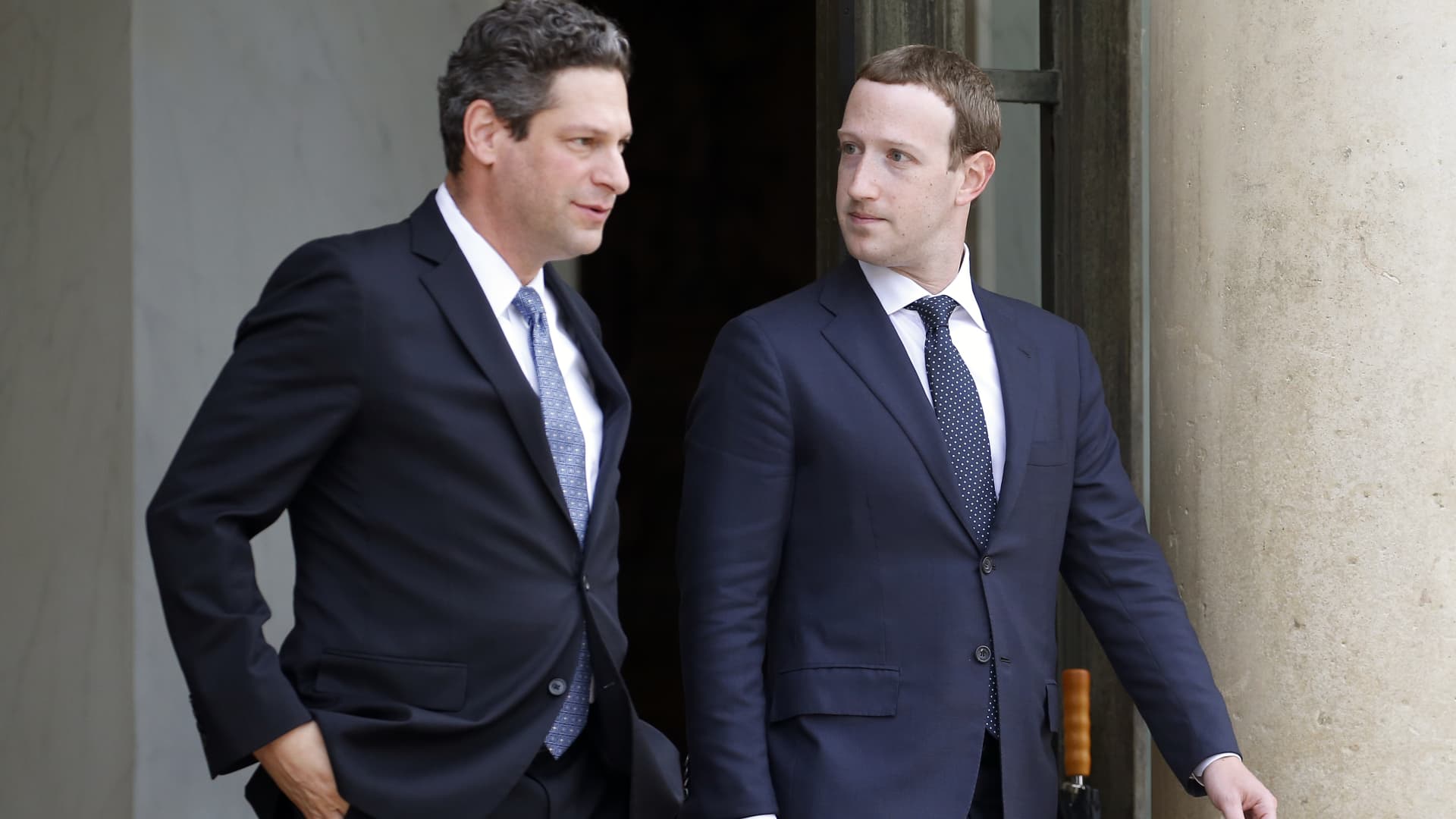 Facebook vice president of global public policy Joel Kaplan and Facebook CEO Mark Zuckerberg leave the Elysee Presidential Palace after a meeting with French President Emmanuel Macron on May 23, 2018 in Paris, France.