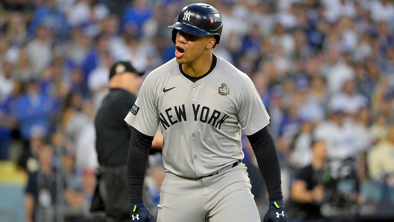 New York Yankees outfielder Juan Soto celebrates after hitting a solo home run in the third inning against the Los Angeles Dodgers during Game 2 of the 2024 MLB World Series at Dodger Stadium. (Jayne Kamin-Oncea-Imagn Images)