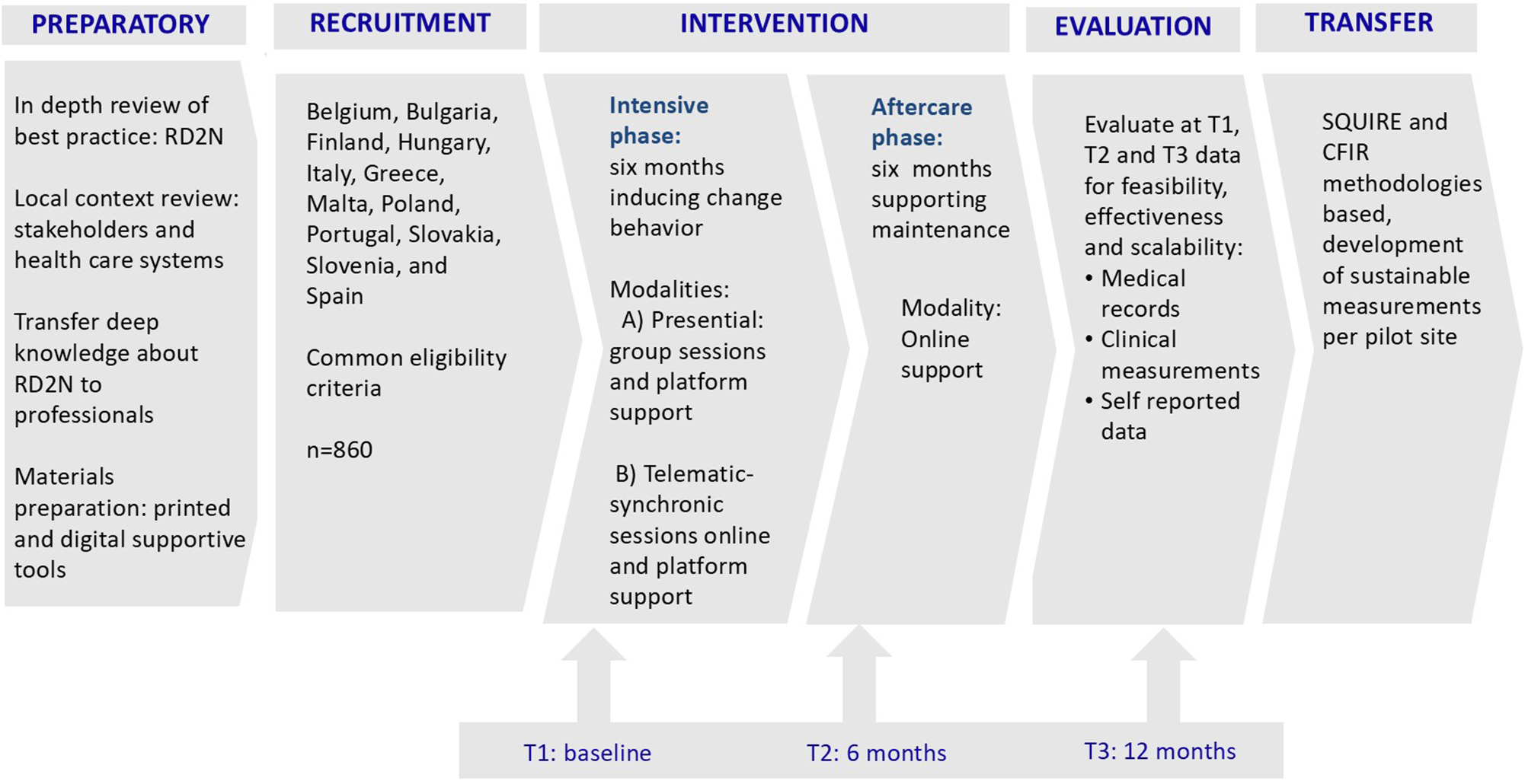 During this preliminary stage, up to 120 healthcare professionals (i.e. up to 10 per country) are directly trained by Dutch RD2N best practice owner for their actions in their countries. The training is designed online over 5 sessions with all selected members of the multidisciplinary team per each country (together), that will receive the “know how” to transmit to people with T2DM the fundamental elements of the intervention. Three formations have been planned with four countries in each formation to effectively deliver the training. Then, local multidisciplinary team members will adapt the content and materials to their respective local languages and context. The main materials that need adaptation are: the participant’s book, recipe book, formative content of the intervention sessions and entries on the digital platform.