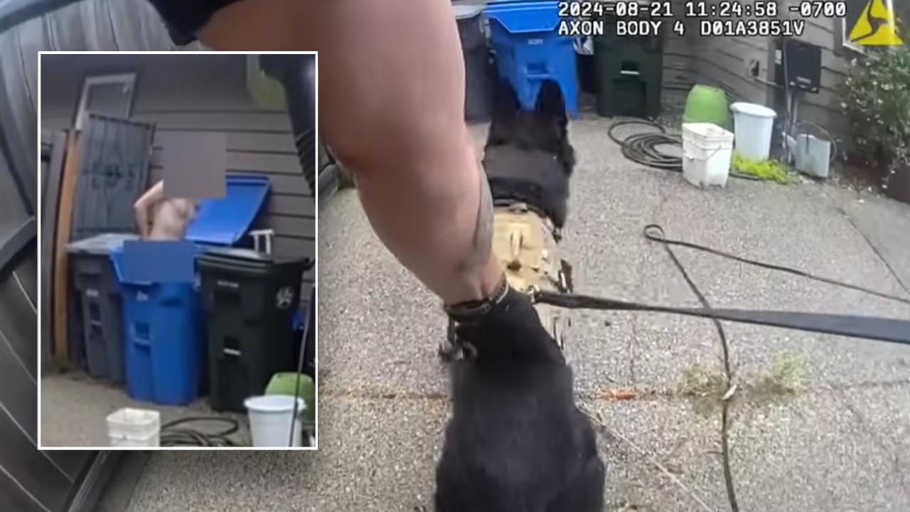 The bodycam footage shows an officer yelling, “He’s running naked! Over the fence!” as a team of officers and the K-9 rushed into a backyard. The dog is then seen sniffing out a trash can, which is where the suspect was found.