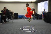Performer Audrey Guerrero, 8, jumps over a hoop during the UTA Native American Heritage Month Kickoff on Nov. 4 in the University Center’s Rio Grande Ballroom. Guerrero performed a hoop dance.