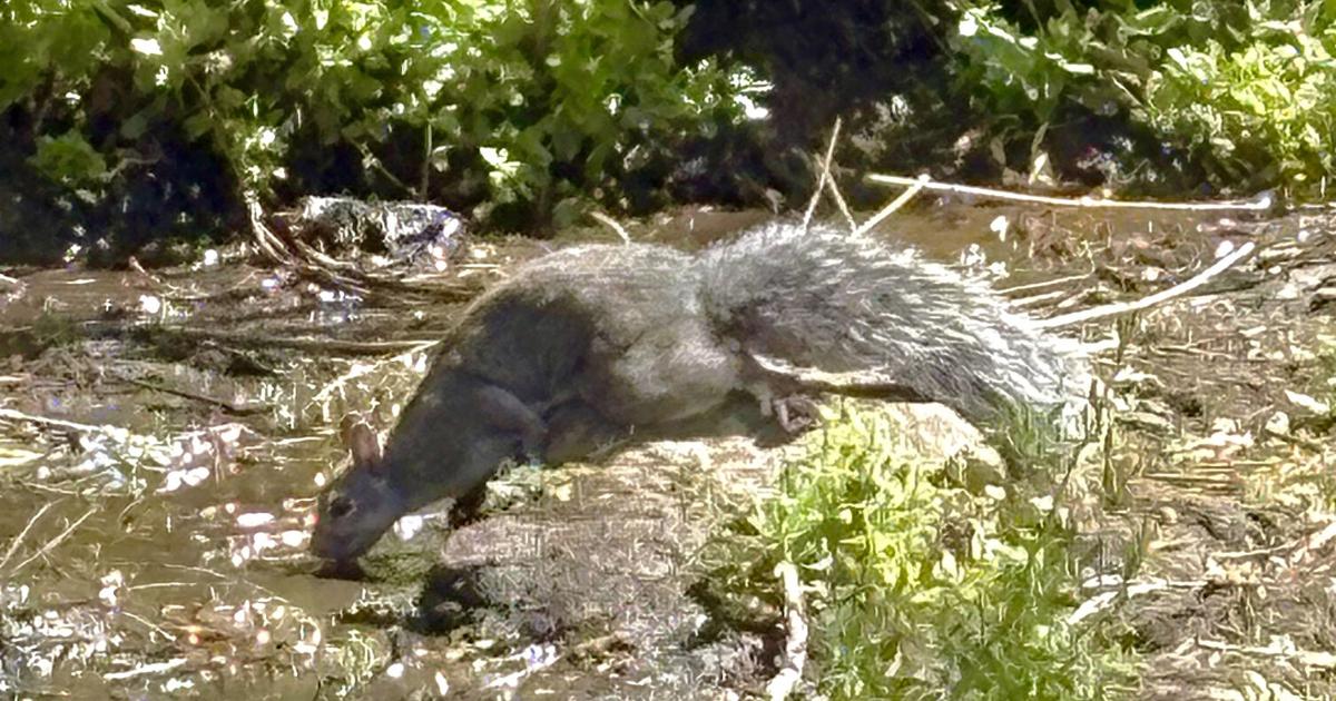 Jim Jenkins took this photo at Tehachapi Mountain Park of a Western Gray Squirrel (Sciurus griseus) drinking from the little seep below the old duck pond.