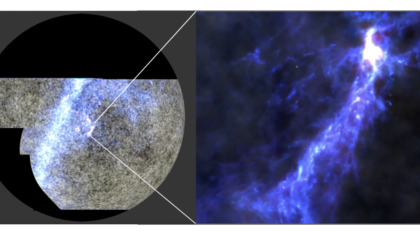 A new half-sky image from the Atacama Cosmology Telescope combines three wavelengths of light to show the Milky Way galaxy in purple and the cosmic microwave background in gray. On the right, the image is zoomed in to show the Orion Nebula.