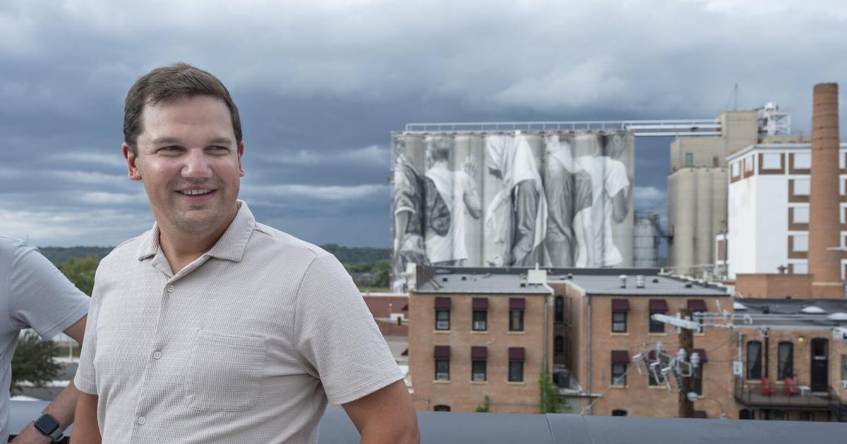 The silo mural in Old Town Mankato is visible from a staged apartment at the Silos Apartments.