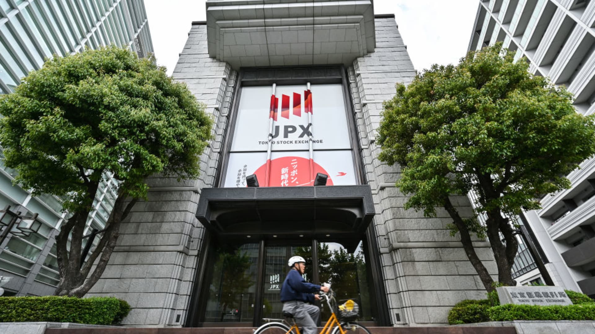 A cycler passes the entrance to the Tokyo Stock Exchange (TSE) headquarters building in the Nihonbashi area of Tokyo on May 2, 2024.