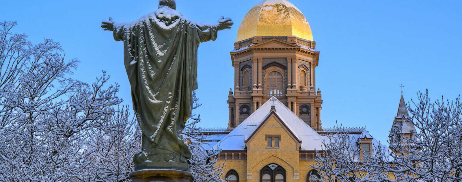 Snow-dusted Sacred Heart of Jesus statue with arms outstretched, seen from the back. Behind it, Notre Dame's Golden Dome Main Building and snow-covered trees are under a bright blue sky. (Main Quad on a snowy morning)