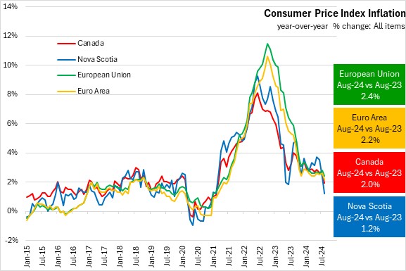 Nova Scotia’s all items Consumer Price Index (CPI) slowed to 1.2% year-over-year in August 2024, down from 2.3% year-over-year in July.