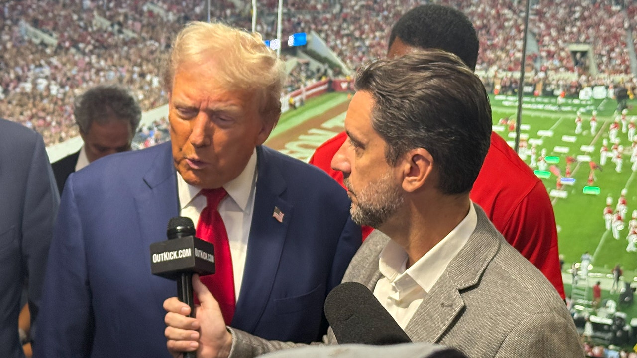 OutKick founder and Fox News contributor Clay Travis interviews former President Trump during halftime of Saturday’s Georgia-Alabama football game in Tuscaloosa, Ala. (Charles Hunnell / OutKick)