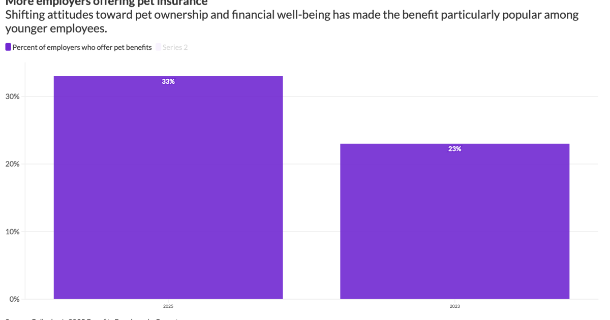 The number of employers offering pet insurance has increased to 33% from 23% in 2023, according to Gallagher’s 2025 Benefits Benchmarks Report, which found that “the expansion of quality-of-life products within the voluntary benefits landscape represents a significant change in how employers approach employee well-being.”