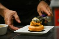 Crab meat gets put on an arepa de coco on Sept. 23 at Sajorí Puerto Rican Cuisine. Arepa de coco con salmorejo is one of the starter items on the Sajorí menu.