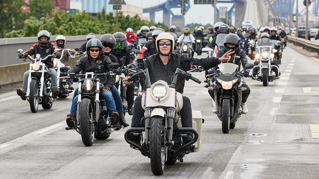 Participants in the Hamburg Harley Days Parade ride over the Köhlbrand Bridge in Hamburg, Germany, on June 30. (Georg Wendt/picture alliance/Getty Images)