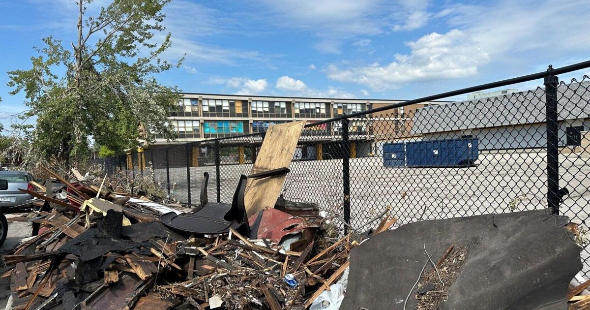 Tornado damage and debris are seen at Yeatman-Liddell Middle School, a St. Louis Public school in the 4600 block of Athlone Avenue, in the O’Fallon neighborhood of St. Louis.