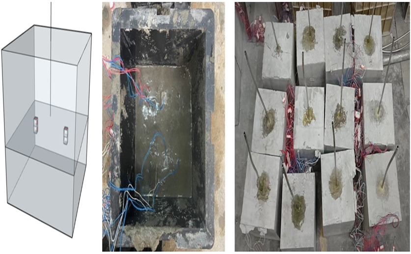 Scientists created these layered sample cubes in the lab, embedding a small sensor between the simulated roof rock and coal seam layers to measure fracture growth during experiments.