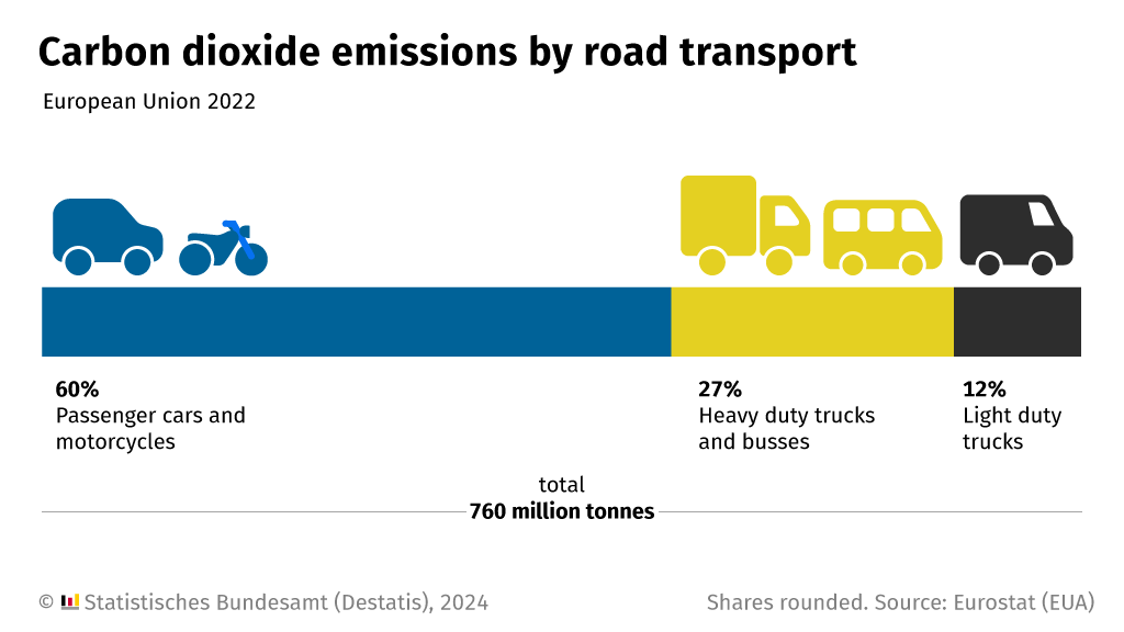 Around 760 million tonnes of carbon dioxide were emitted in the EU in 2022 from the road transport fuel combustion. Passenger cars and motorcycles accounted for the largest share of emissions (60%). Heavy duty trucks and busses accounted for 27% and light duty trucks for a further 12%.