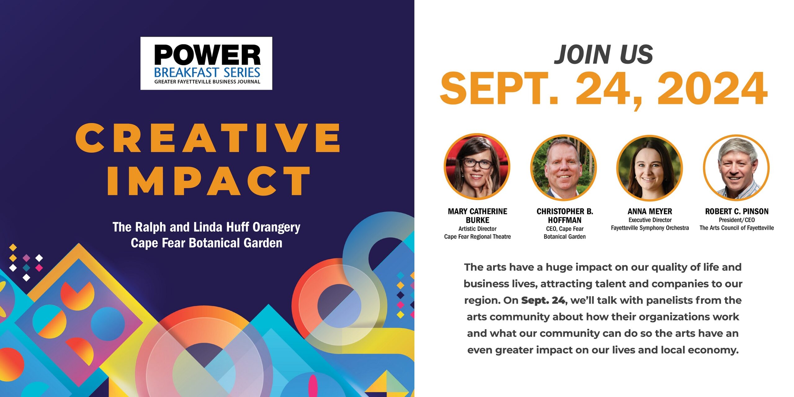 The Greater Fayetteville Business Journal is excited to welcome the business community to our third Power Breakfast of 2024. Everyone is invited to join us at the Ralph and Linda Huff Orangery at Cape Fear Botanical Garden on Sept. 24 from 7:30 a.m. to 9:30 a.m.