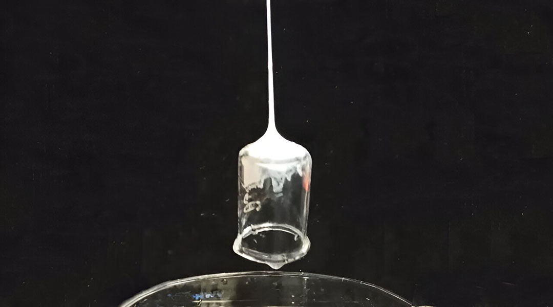 The scientists boosted the tensile strength of the solution by 200 times with another invertebrate-related ingredient, chitosan, a fibrous sugar found in the exoskeletons of shellfish like crab, lobster, and shrimp. They also boosted the stickiness of the threads by around 18 times by adding a borate buffer.