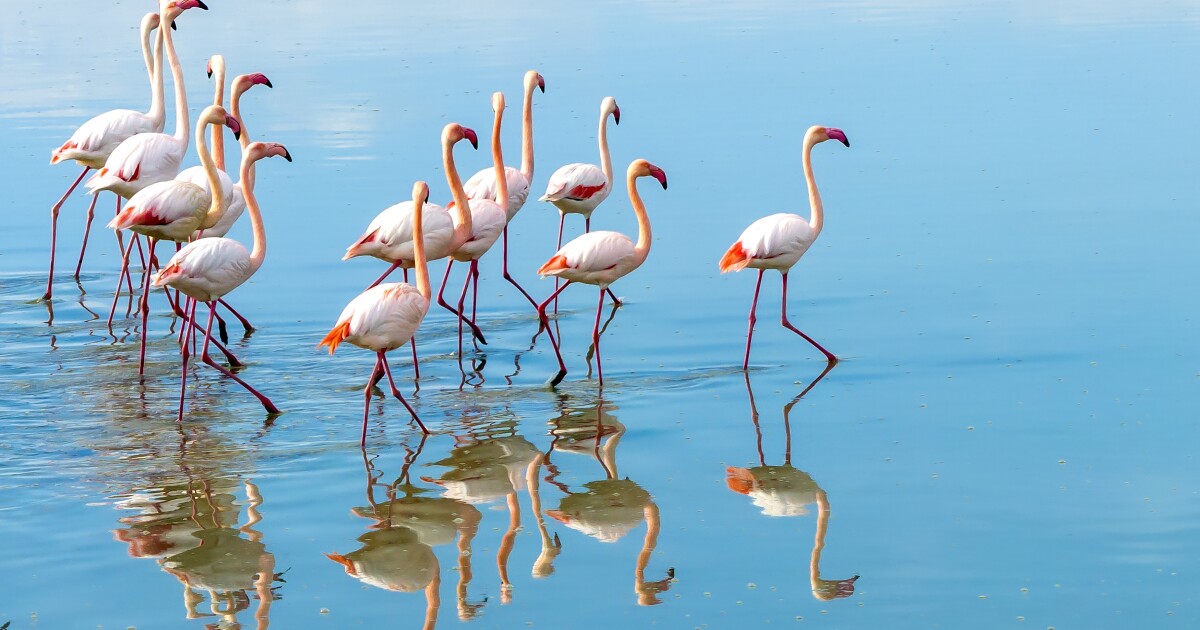 Then there’s the strange stomping of their feet. The study finds that flamingos’ webbed toes create a pair of vortices that push food toward their bills. That’s why it makes sense to have the head facing the feet instead of whatever is in front of them.