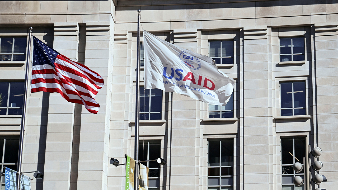 A USAID flag flies outside headquarters in Washington, D.C.
