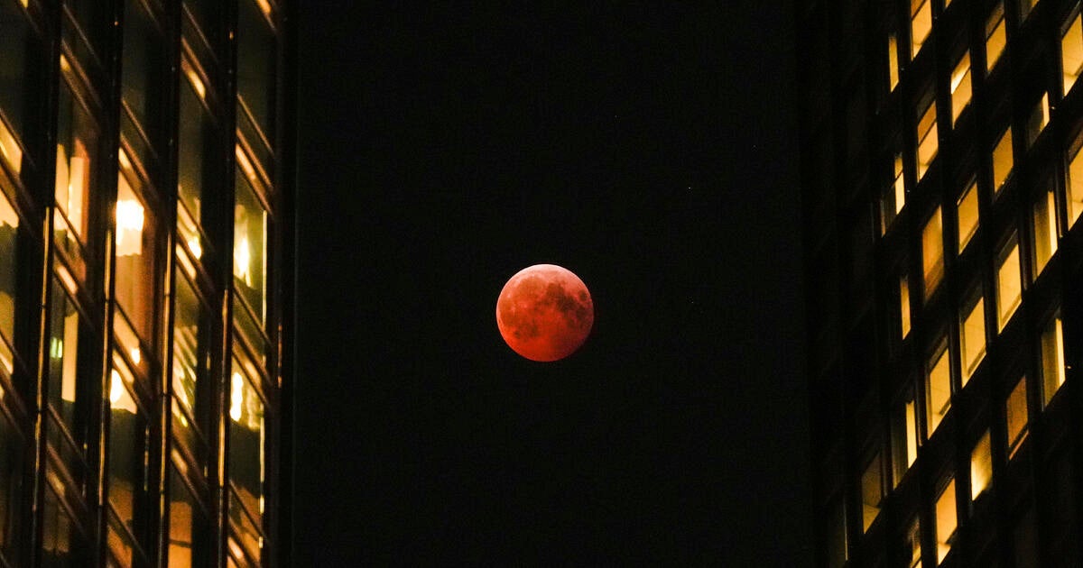 A total lunar eclipse is visible between skyscrapers Friday, March 14, 2025, in downtown Chicago.