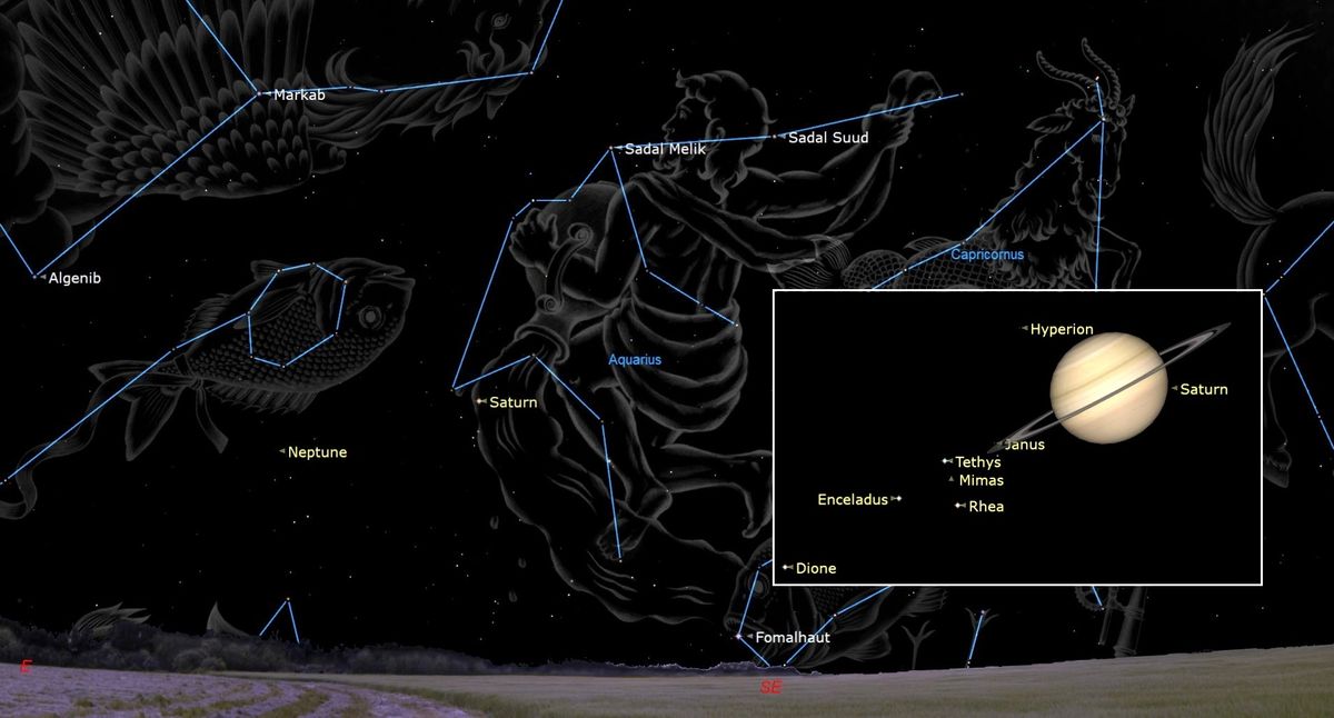 Appearing in the constellation Aquarius, Saturn will be visible for much of the night, rising at around the same time that the sun sets, and setting at around the same time that the sun rises. The planet will officially reach opposition at 12:27 a.m. EDT  (0427 GMT) on Sunday, Sept. 8, and then shortly after reach its highest point in the sky at 12:50 a.m. EDT (0450 GMT), according to In-the-Sky.org.