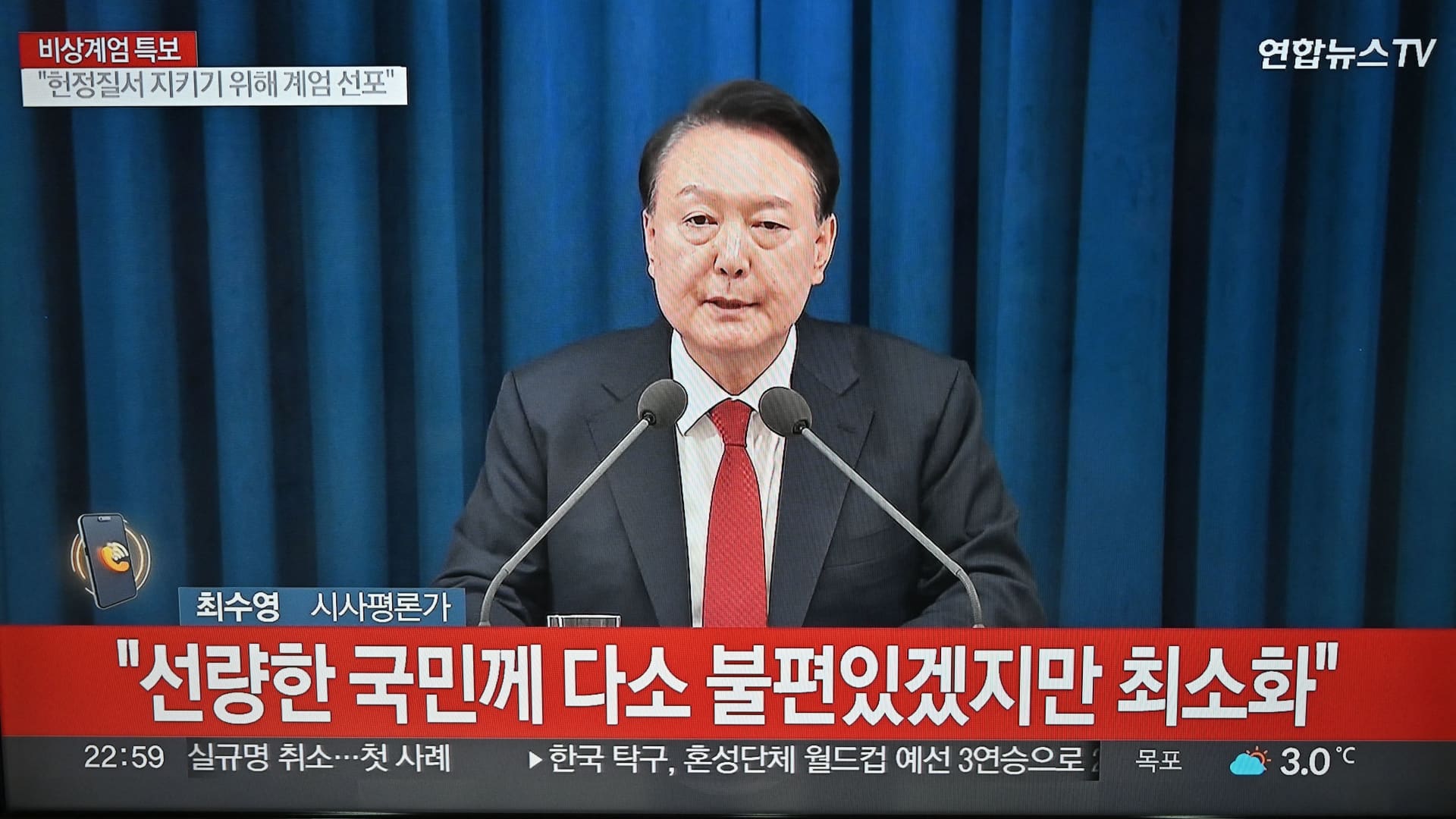 A television screen shows a news broadcasting of South Korean President Yoon Suk Yeol delivering a speech on emergency martial law, in Goyang, northwest of Seoul, on December 3, 2024.