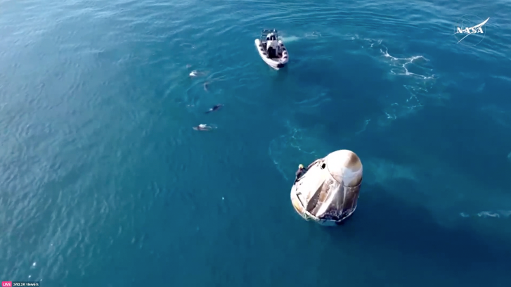 Moments after Tuesday’s SpaceX Crew Dragon capsule splashdown off Florida’s panhandle, a pod of dolphins begins playing around the capsule.
