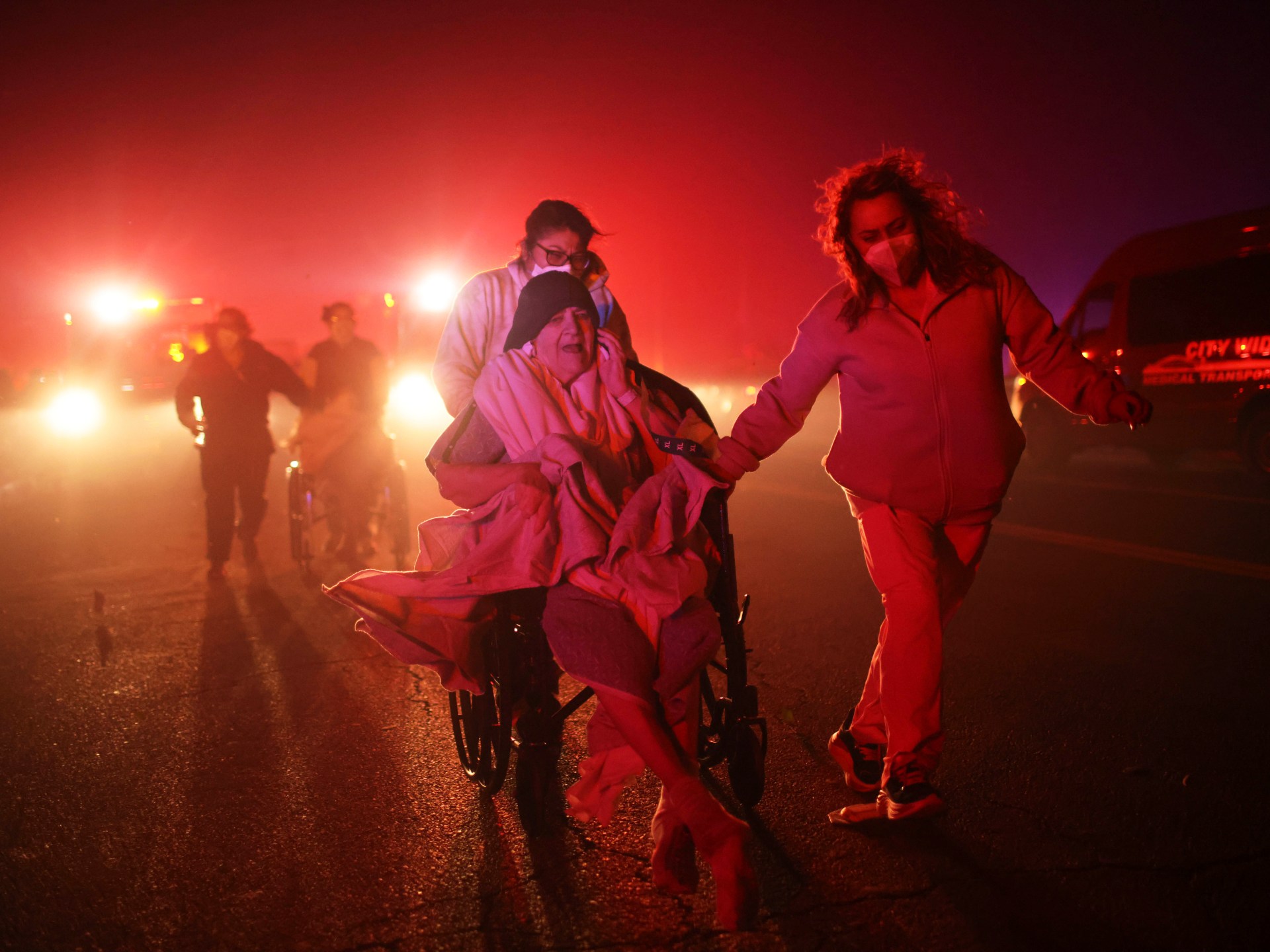 The blaze that broke out on Tuesday evening in the foothills northeast of Los Angeles spread so rapidly that staff at a senior living centre had to push dozens of residents in wheelchairs and hospital beds down the street to a car park.