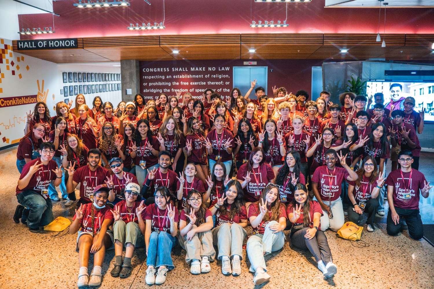 Students in the RISE Leadership Institute pose during summer camp in front of ASU’s Old Main building on the Tempe campus. Photo by Kaitlyn Beickel