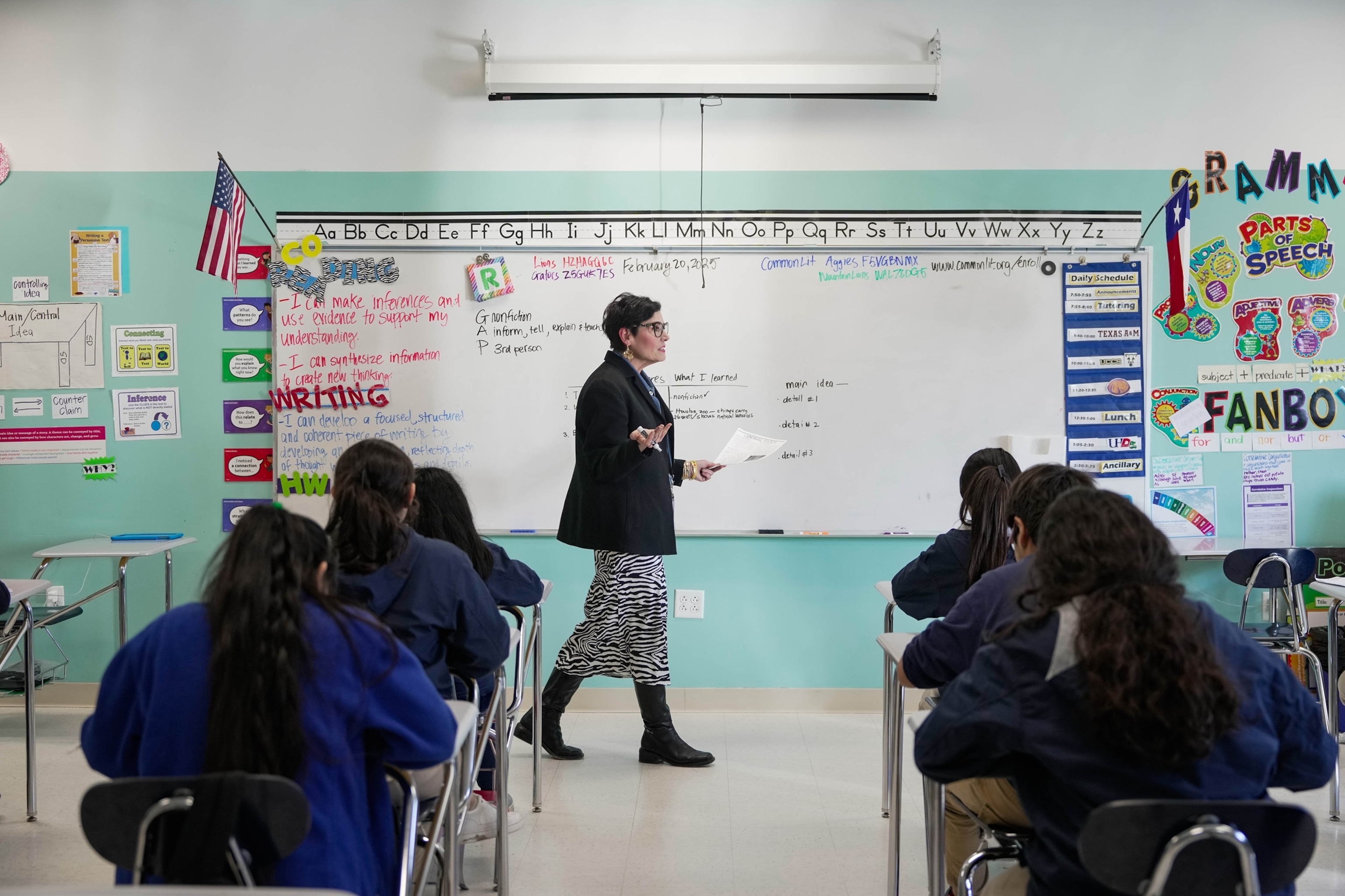 In this Feb. 20, 2025, file photo, sixth grade reading teacher Graciela De Cardenas teaches a class of students at the Amigos Por Vida or Friends for Life charter school in Houston.