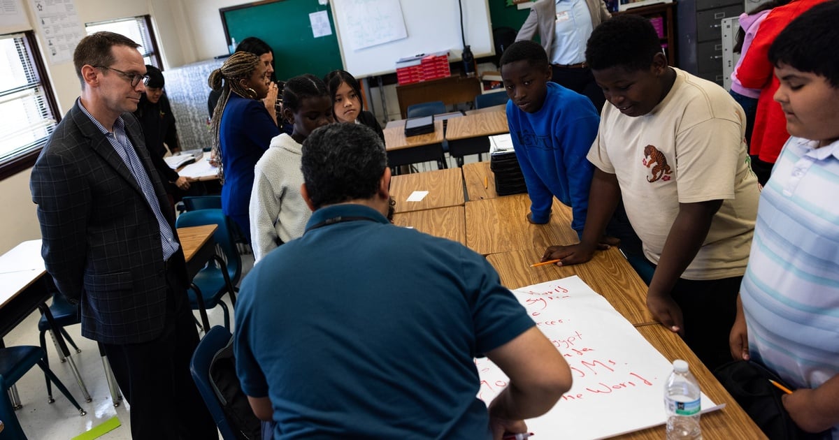 Texas Education Commissioner Mike Morath watches a group of seventh graders read a poem in Fort Worth ISD’s William James Middle School on Aug. 28, 2025.