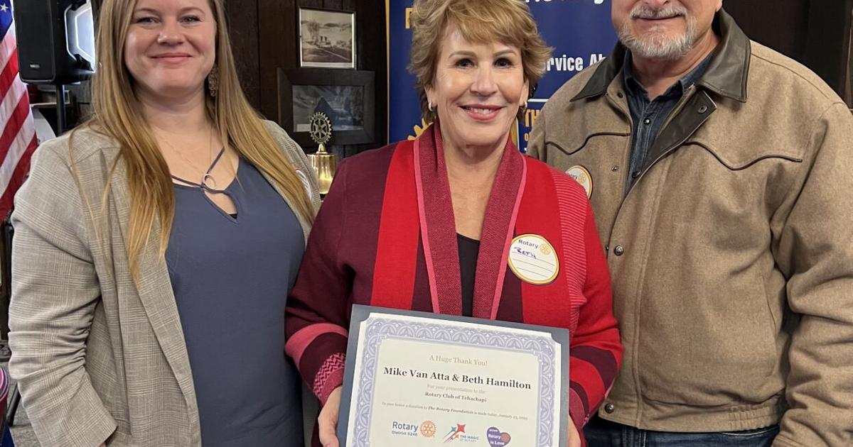 At the Jan. 23, 2025 meeting of the Rotary Club of Tehachapi, the guest speakers were Mike Van Atta and Beth Hamilton from the Tehachapi Wine & Cattle Company. Mike is also the current president of the Tehachapi Wine Growers Commission. Mike and Beth have been together for almost 40 years. Bringing a variety of career experience with them, they joke that they failed at retirement and decided to embark on a new adventure of owning a winery.