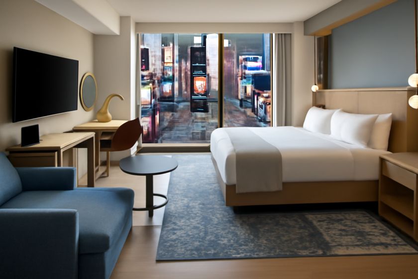 Guests staying at Tempo by Hilton Times Square enjoy breathtaking, expansive views of Times Square from floor-to-ceiling windows, providing a stunning backdrop throughout their visit. The hotel features an energetic cocktail lounge with an outdoor terrace, creating a perfect setting for relaxation and socializing amid the city’s vibrant atmosphere.