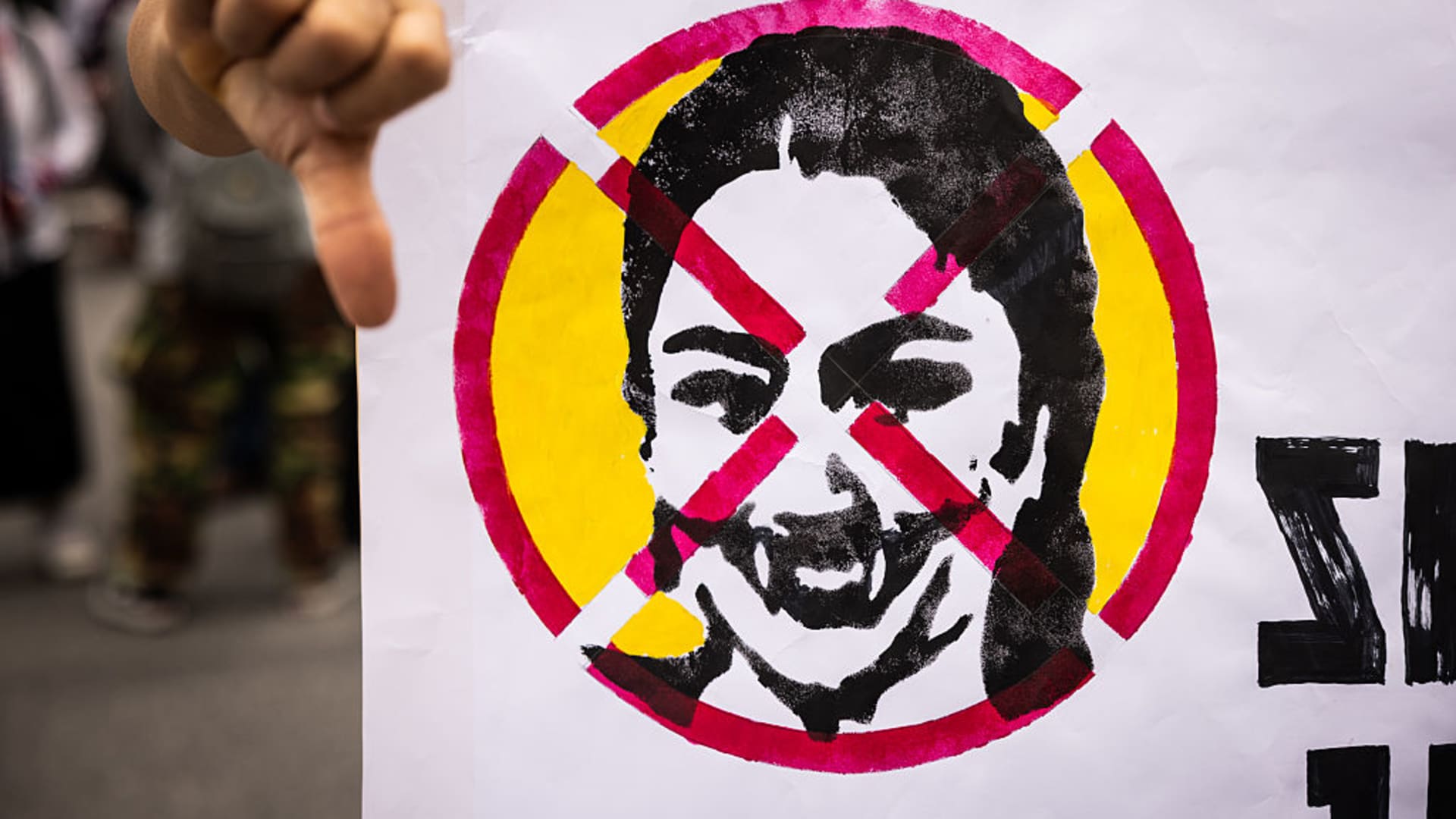 Protesters hold a sign with a photo of Prime Minister Paetongtarn Shinawatra crossed out at Victory Monument on June 28, 2025 in Bangkok, Thailand. Thousands of protesters gathered at Bangkok’s Victory Monument to demand Prime Minister Paetongtarn Shinawatra resign over a leaked phone call linked to a border dispute with Cambodia. It was the largest anti-government rally since 2023, adding pressure ahead of a possible no-confidence vote.