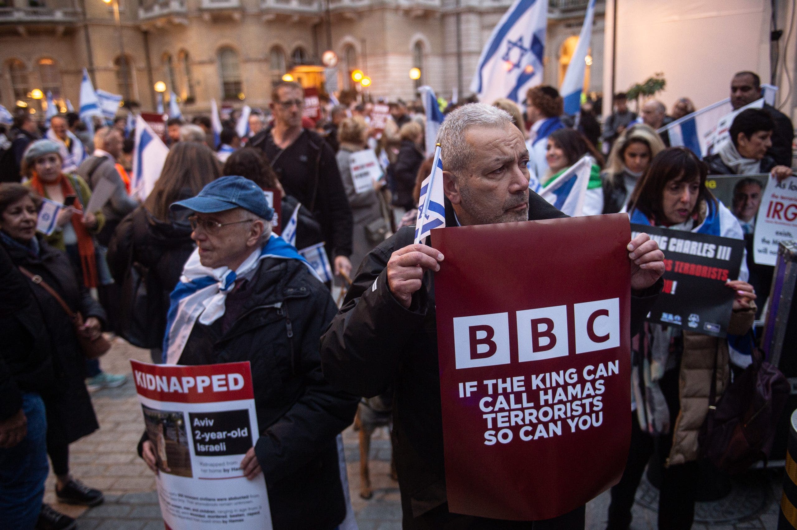 Hundreds attend a protest called by the National Jewish Assembly, The Campaign Against Antisemitsim and the UK Lawyers for Israel at the BBC Broadcasting House on October 16, 2023, in London, England. (Photo by Guy Smallman/Getty Images)