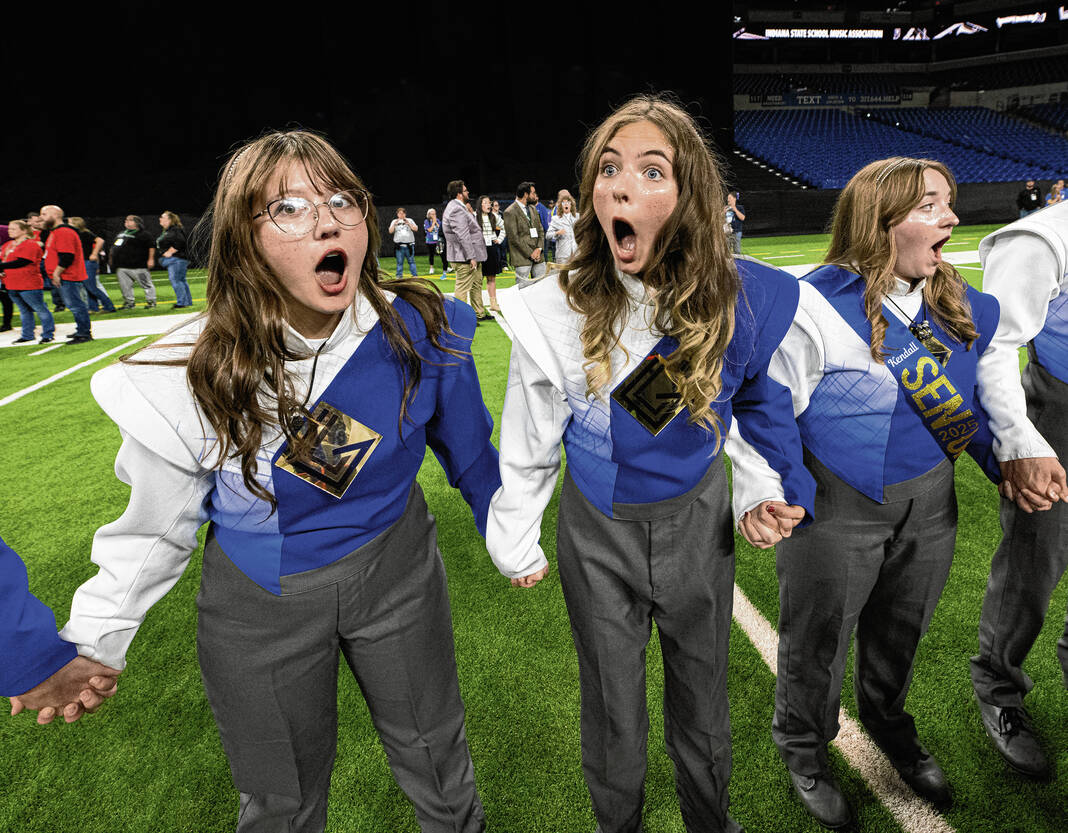 After the final two bands of the division performed, all 10 returned to the field for awards. After seven bands heard their names called, a surprising announcement rang out over the public address system alerting bands and fans that there was a tie for second place. The Cougar Pride prepared to hear its name called as one of the two runners-up after coming in third in semi-state, but when the second name rang out as Greenwood, not Greenfield, the sea of blue assembled just inside the 35-yard line began to bustle excitedly as it realized only one name remained, and a cheer went up from the band as Greenfield-Central High School was announced as the 2024 state champs.