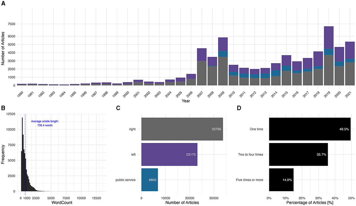 Figures 1A–D present descriptive statistics of the dataset. Figure 1A shows the number of articles over time and how the climate change agenda has regained momentum in the latter part of the 2010s. To integrate political leaning as a covariate in the model estimation process, we have assigned each newspaper to one of three categories (Figure 1C): center-right (53%), center-left (36%) or public service (11%). Here we follow a traditional right-left political scale used in previous research (Hjarvard and Kristensen, 2014), while also recognizing that news from Public Service Broadcast corporations should be excluded from such a categorization, as these corporations are required to stay politically neutral. This distribution confirms a well-established observation that users of right-wing media, which often cater to more affluent readers, have access to a wider news selection than the less affluent part of the population (Richardson, 2007). Article length ranges from 101 to 13,429 words, with an average of 738.4 words (Figure 1B).