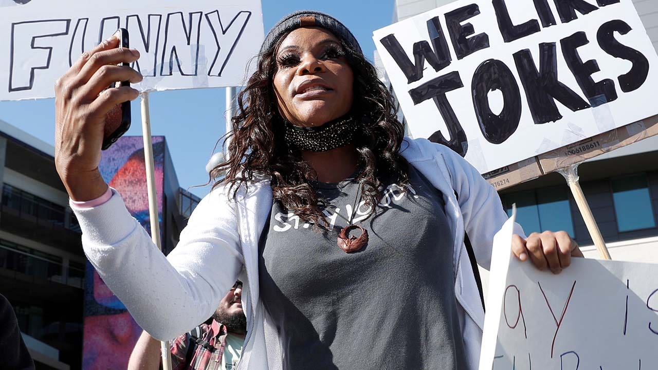 Trans activist Blossom Brown speaks in front of counter protesters while attending a rally in support of the Netflix transgender employee walkout “Stand Up in Solidarity” to protest the streaming of comedian Dave Chappelle’s new comedy special, in Los Angeles, California, on October 20, 2021. (Reuters/Mario Anzuoni)