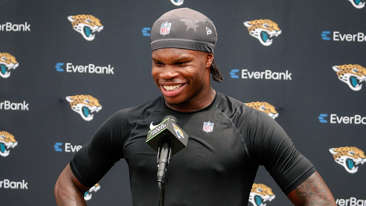 Jaguars wide receiver Travis Hunter runs a route duringrookie minicamp at Miller Electric Center Saturday, May 10, 2025 in Jacksonville, Florida. (Corey Perrine/Florida Times-Union)