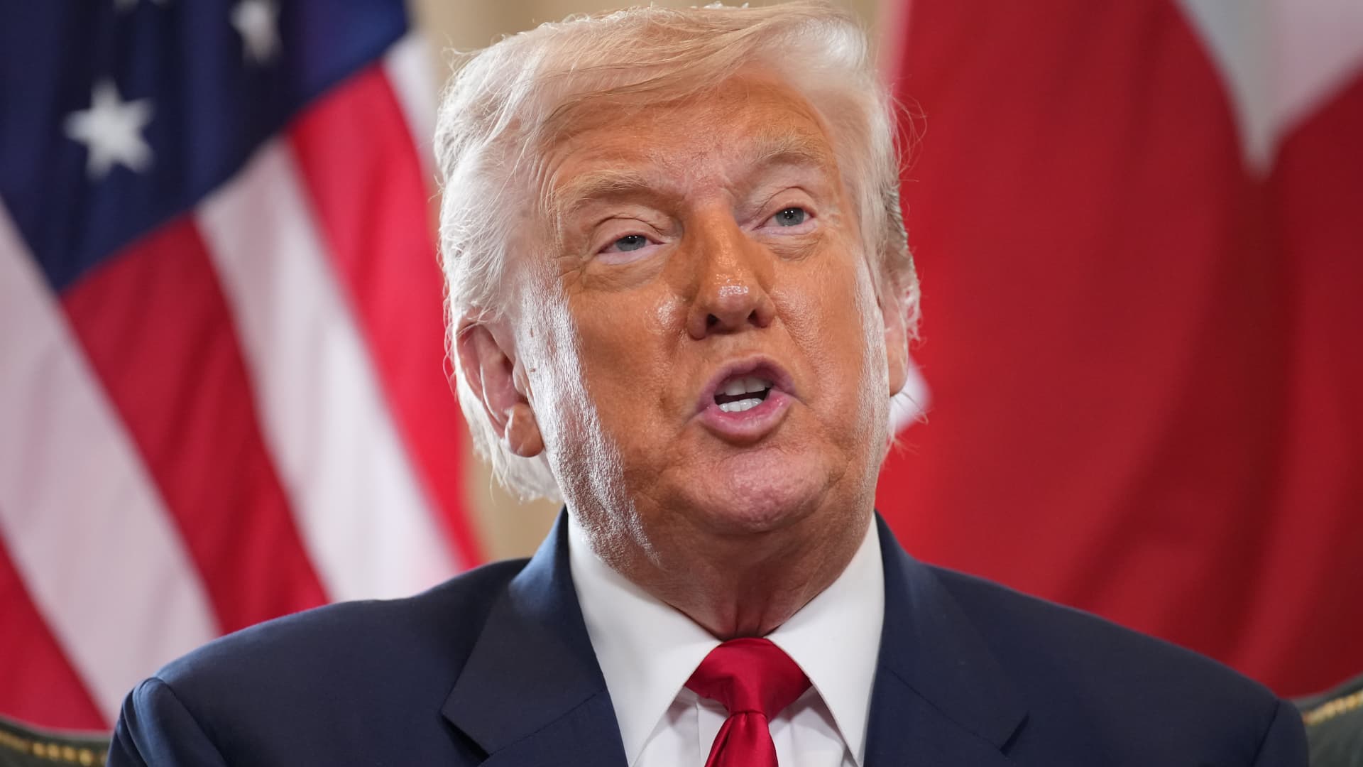 U.S. President Donald Trump reacts as he meets British Prime Minister Keir Starmer for bilateral talks at Trump Turnberry golf club on July 28, 2025 in Turnberry, Scotland.