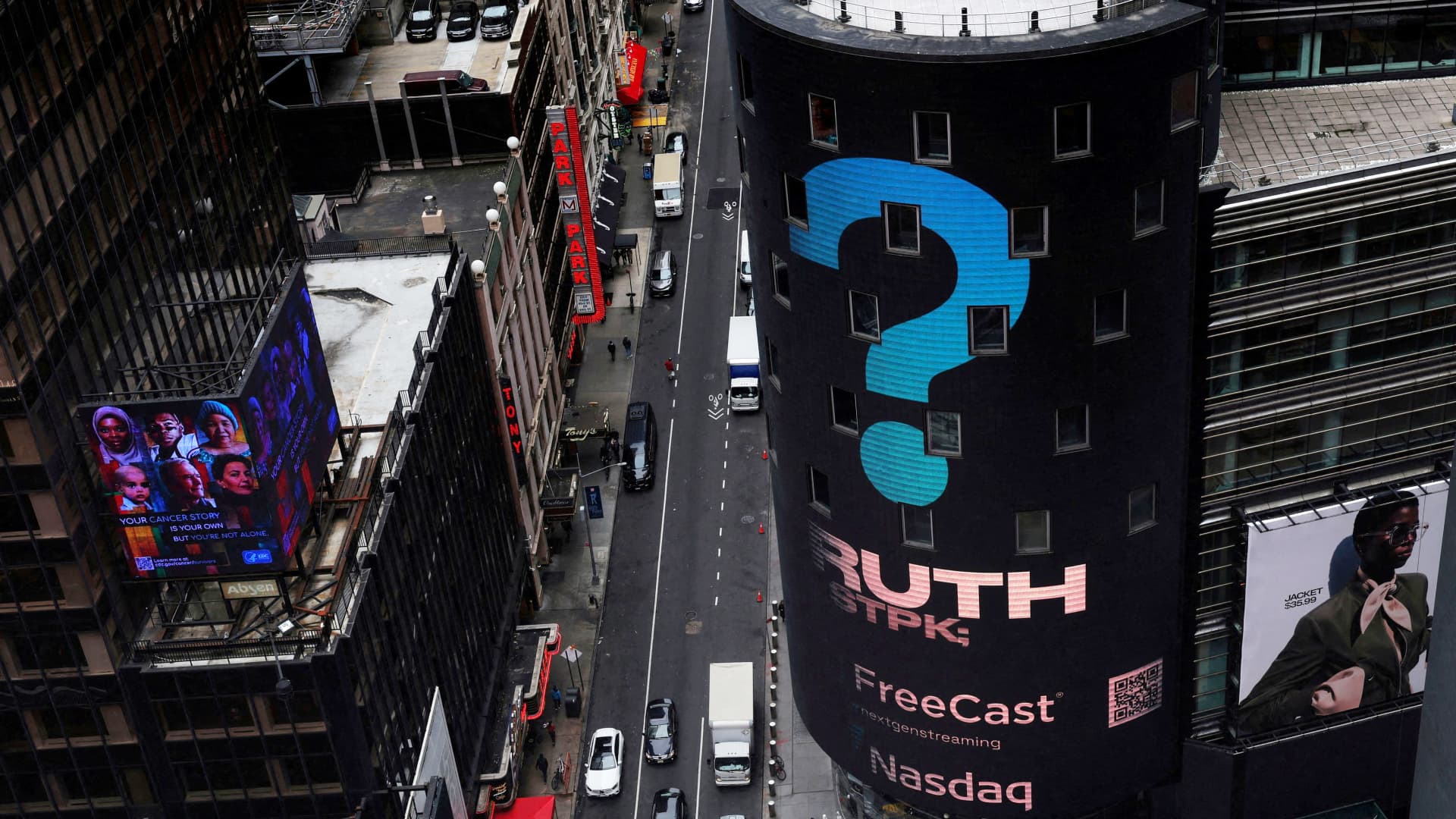 The Nasdaq Market site is seen on the day that shares of Truth Social and Trump Media & Technology Group start trading under the ticker “DJT”, in New York City, U.S., March 26, 2024.