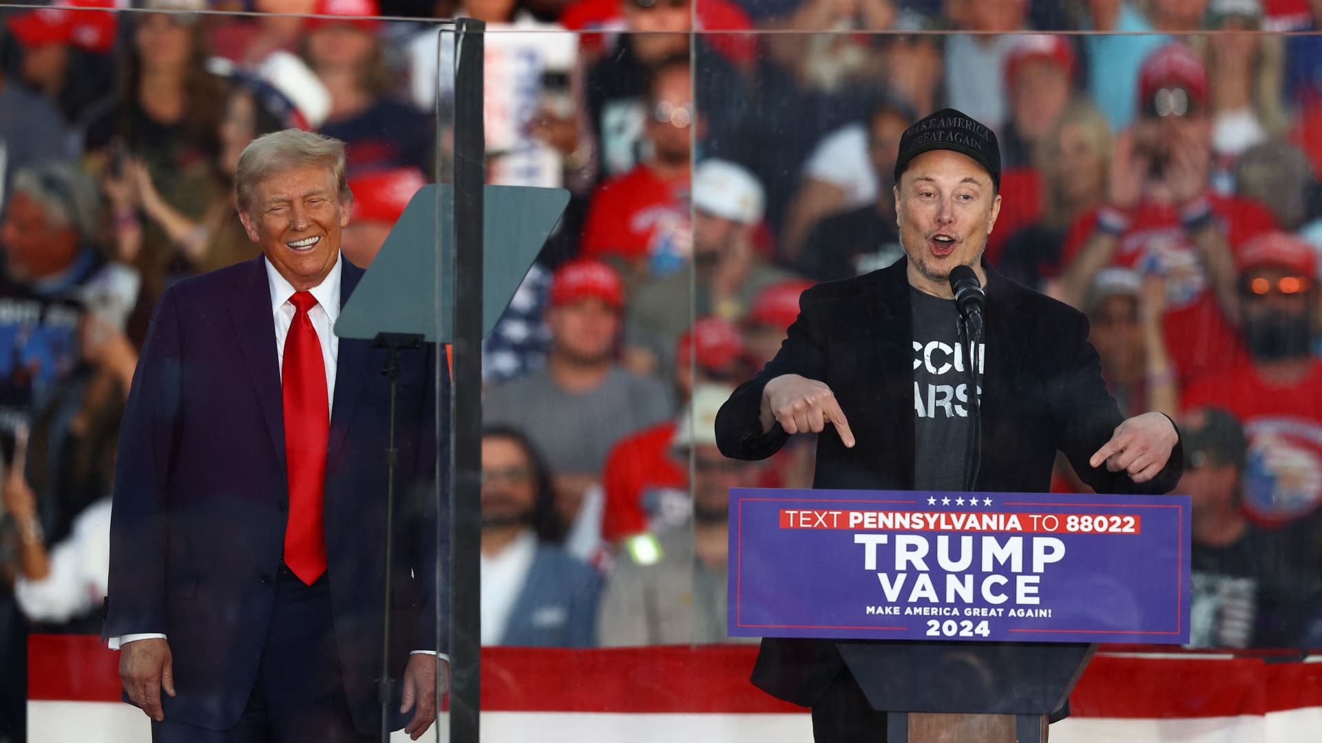 Tesla CEO and X owner Elon Musk speaks as Republican presidential nominee and former U.S. president Donald Trump reacts during a rally at the site of the July assassination attempt against Trump, in Butler, Pennsylvania, U.S., October 5, 2024.