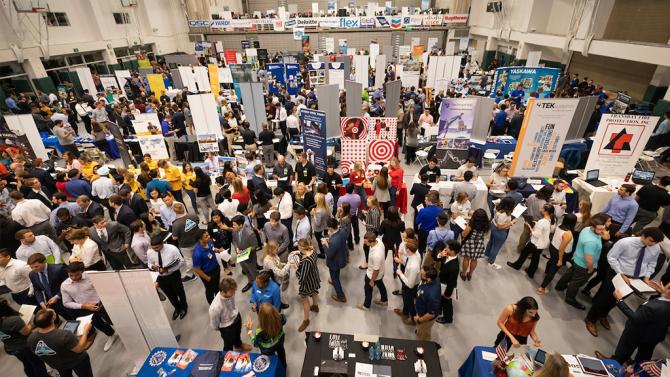 The annual career fair hosted by Cal Poly Career Services includes over 150 employers from a variety of industries. Students can access the list of recruiters in MustangJobs via their portal.