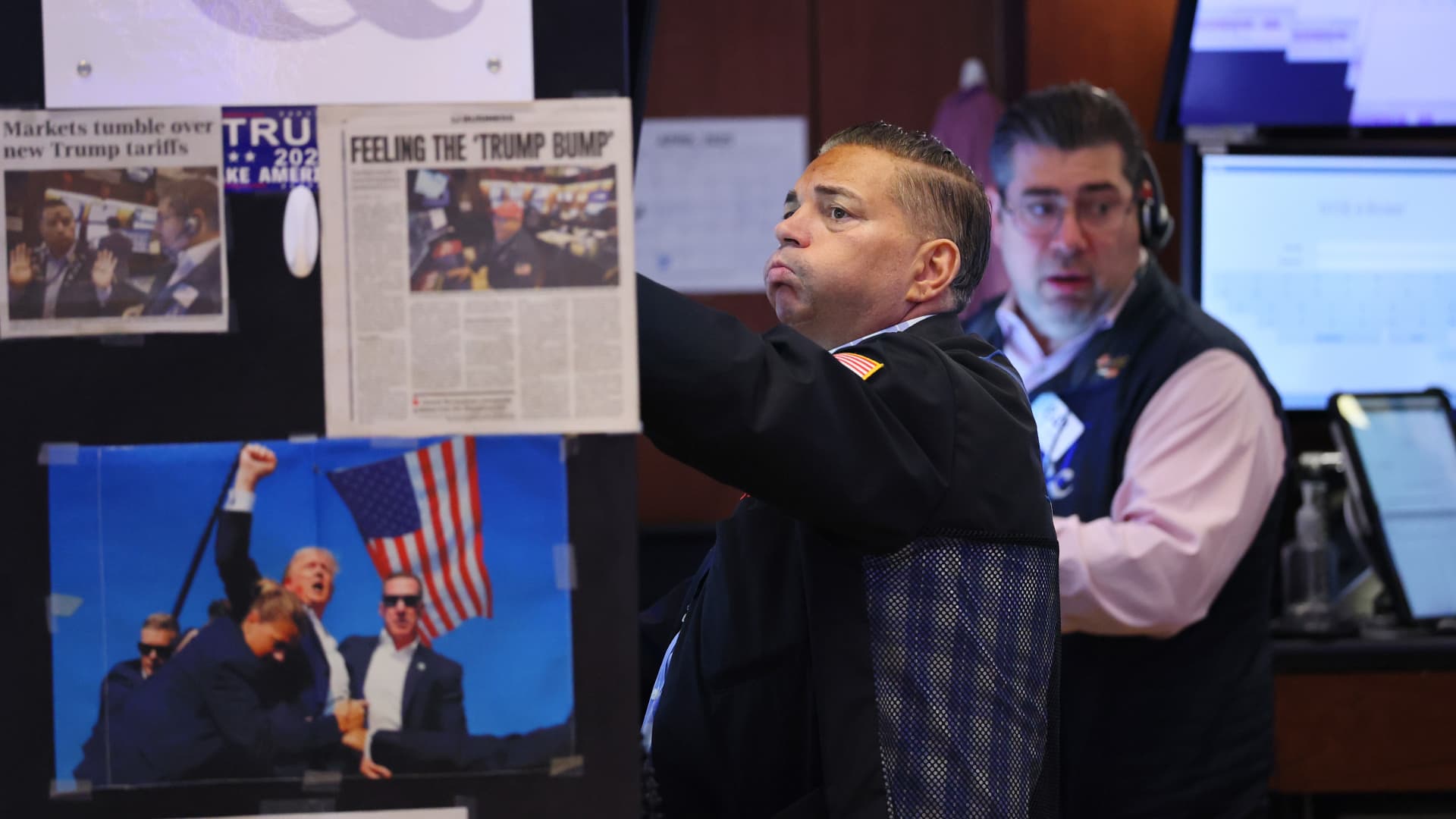 Traders work on the floor of the New York Stock Exchange during morning trading on April 30, 2025 in New York City.