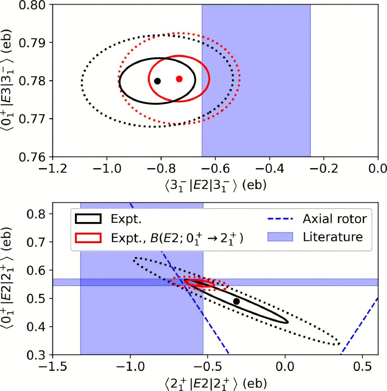 Mean values (points) and confidence regions corresponding to 1 σ (solid lines) and 2 σ (dotted lines) for the ⟨ 0 +1 | E3 | 3 −1⟩ and ⟨ 3 −1| E2 | 3 −1⟩ matrix elements (top), and the ⟨ 0 +1| E2 | 2 +1⟩ and ⟨ 2 +1| E2 | 2 +1⟩ matrix elements (bottom). Credit: Physical Review Letters (2025). DOI: 10.1103/PhysRevLett.134.062502