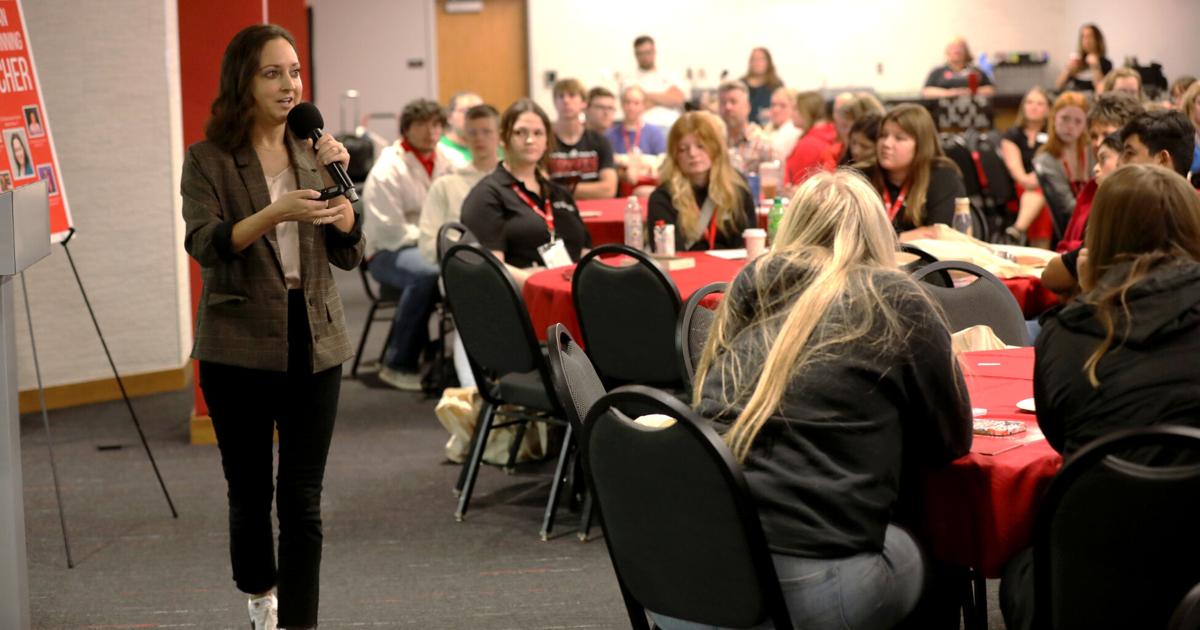 USD alum Rebecka Peterson, the 2023 National Teacher of the Year, addressed the future educators as they met in the DakotaDome Club Room Friday morning, telling them of the crucial role they will soon play in young people’s lives.