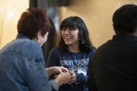 Acting sophomore Itzel Flores smiles while passing a ticket to attendees during the Día de los Muertos Celebration on Nov. 1 at the UTA Wesley Foundation. Free food and drinks were offered to those in attendance.